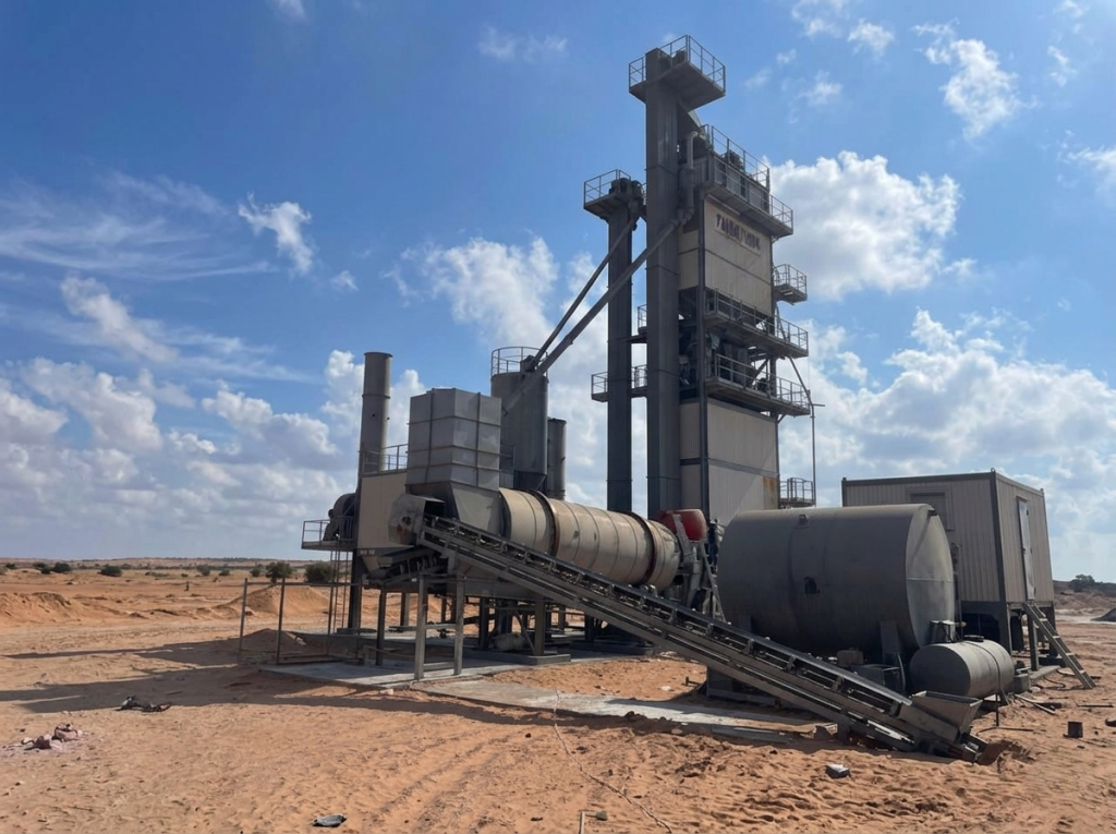 نطاق الأعمال: مصنع أسفلت بقدرة إنتاجية 240 طن/ساعة، مزود بخزانات وقود وخزانات بيتومين (55,000 لتر لكل خزان)، نظام تدفئة مركزي وموقد احتراق